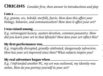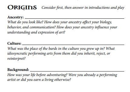 Where in Blue and Red we asked open-ended questions about your Ancestry, Culture, and Background, now there are Class-specific prompts about your past that can be filled in. While the answers can be anything, the examples below provide plenty of ideas, hopefully standing as a solid middle ground between flexibility and direction.